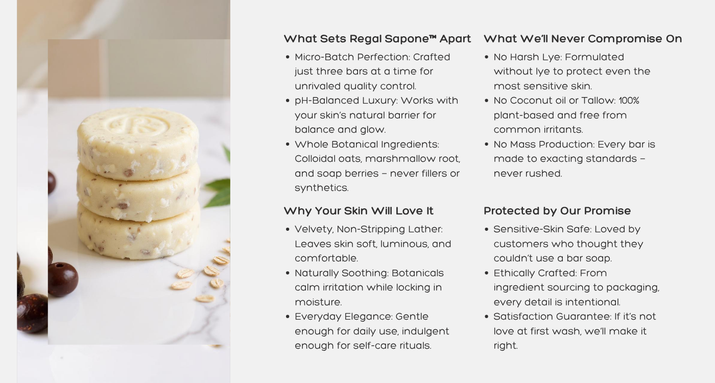 Not all bars are created equal. Regal Sapone™ isn’t soap — it’s a category of its own. Crafted without lye, tallow, or harsh surfactants, each bar is pressed with whole botanicals and balanced to a gentle 5.5 pH, restoring rather than stripping your skin. Every detail, from the signature gold seal to our slow, artisanal process, transforms cleansing into a daily ritual of restoration and refinement.